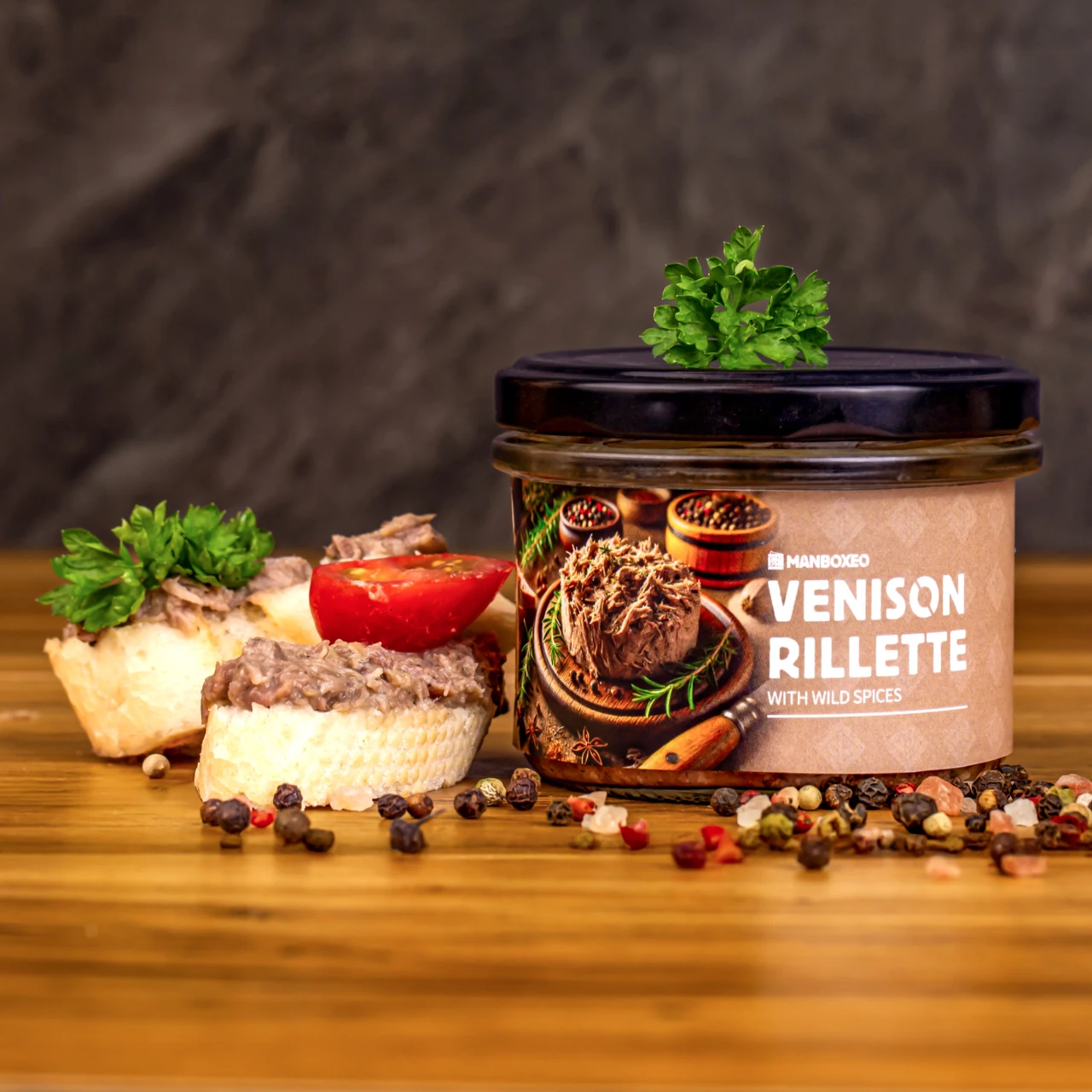 Akár, hogy nem csak az ízlelőbimbóknak, hanem a szemnek is.Szarvashús rillett vadfűszerekkel 170 g - Mr.HomeMade - ez a húskrém az igazi különlegességek közé tartozik. A szarvashúst sertészsírban addig konfitálják, amíg teljesen szét nem esik. Az eredmény egy szokatlanul finom és gazdag ízvilág, amelyet borókabogyó és babérlevél keveréke fokoz. Friss, ropogós kenyérszeletre vagy gyógynövényes bagettre kenve a legjobb.
