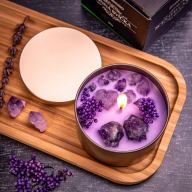 FÉM ILLATGYERTYA díszdobozban 200g – LEVENDULA – Ez az isteni levendulaillatú gyertya tökéletesen betölti otthonod fényével és illatával. Szárított virágokkal és csillogó kavicsokkal díszített, melyek égés közben varázslatosan csillognak.