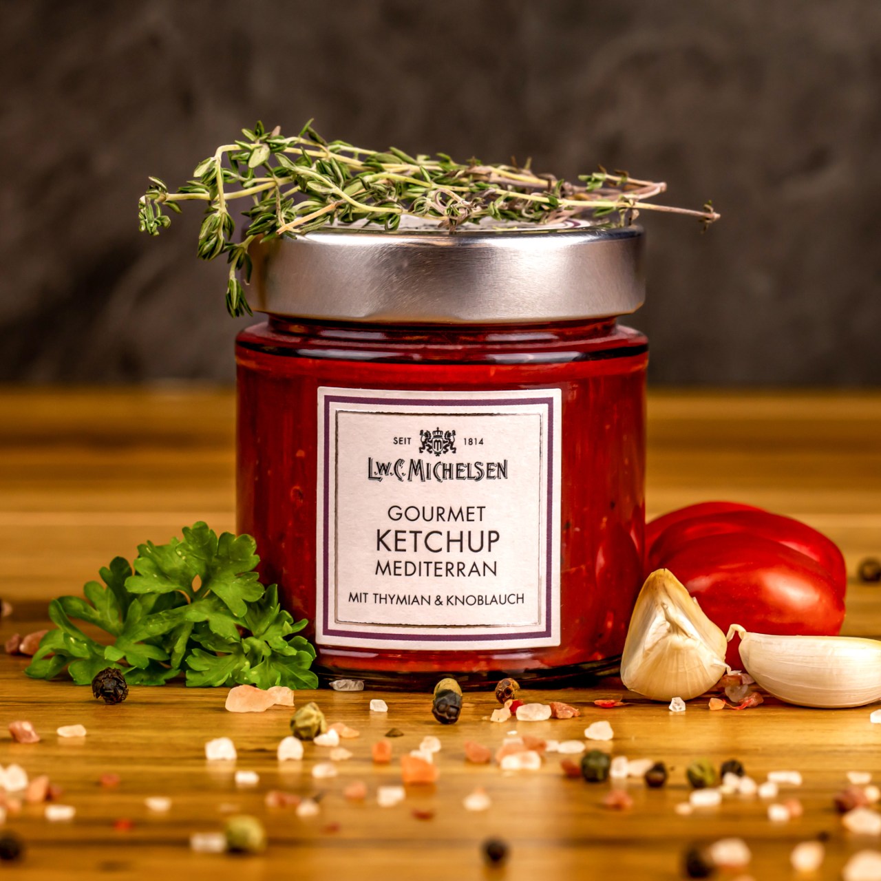 Ketchup mediterrán ízesítéssel, kakukkfűvel és fokhagymával – Minőségi, ízletes ketchup mediterrán beütéssel, kakukkfűvel és fokhagymával megbolondítva. Tökéletes grillezett ételekhez, tésztákhoz vagy mártogatósként.