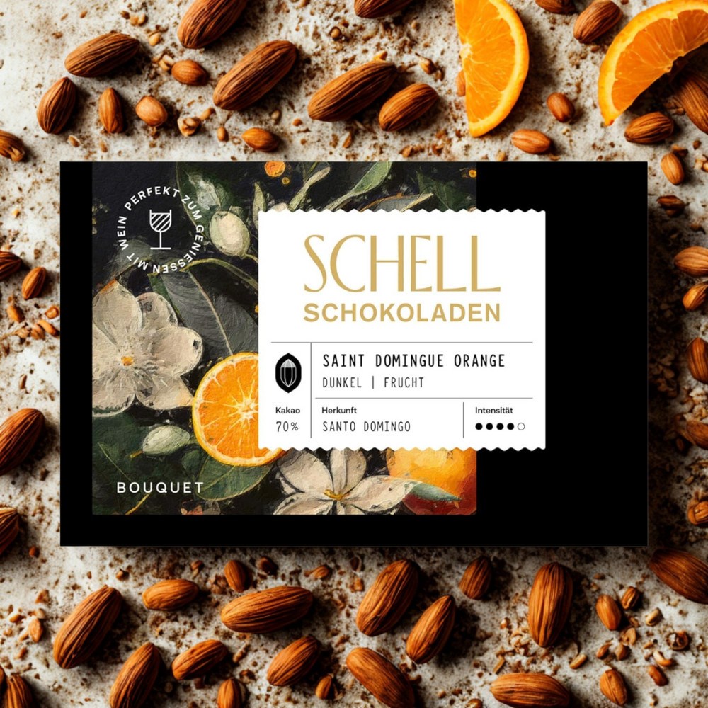 Étcsokoládé Schell Saint Domingue Narancs 50g — Egy kis tábla, tele ízzel. 70%-os étcsokoládé dominikai kakaóból, édes narancshéjjal ízesítve. Vegánoknak is megfelelő – és mindenkinek ajánlott, aki szereti a minőségi édességeket.
