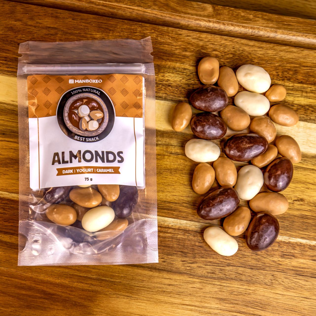Csokoládés mandula Karamell & Étcsokoládé & Joghurt 75g — Csokoládés trikolór, azaz mandula, ami mindenből tartalmaz egy kicsit. Egy kis keserűség, egy kis édesség, egy kis lágyság – és rengeteg tökéletes íz, amit sokáig nem felejtesz el.