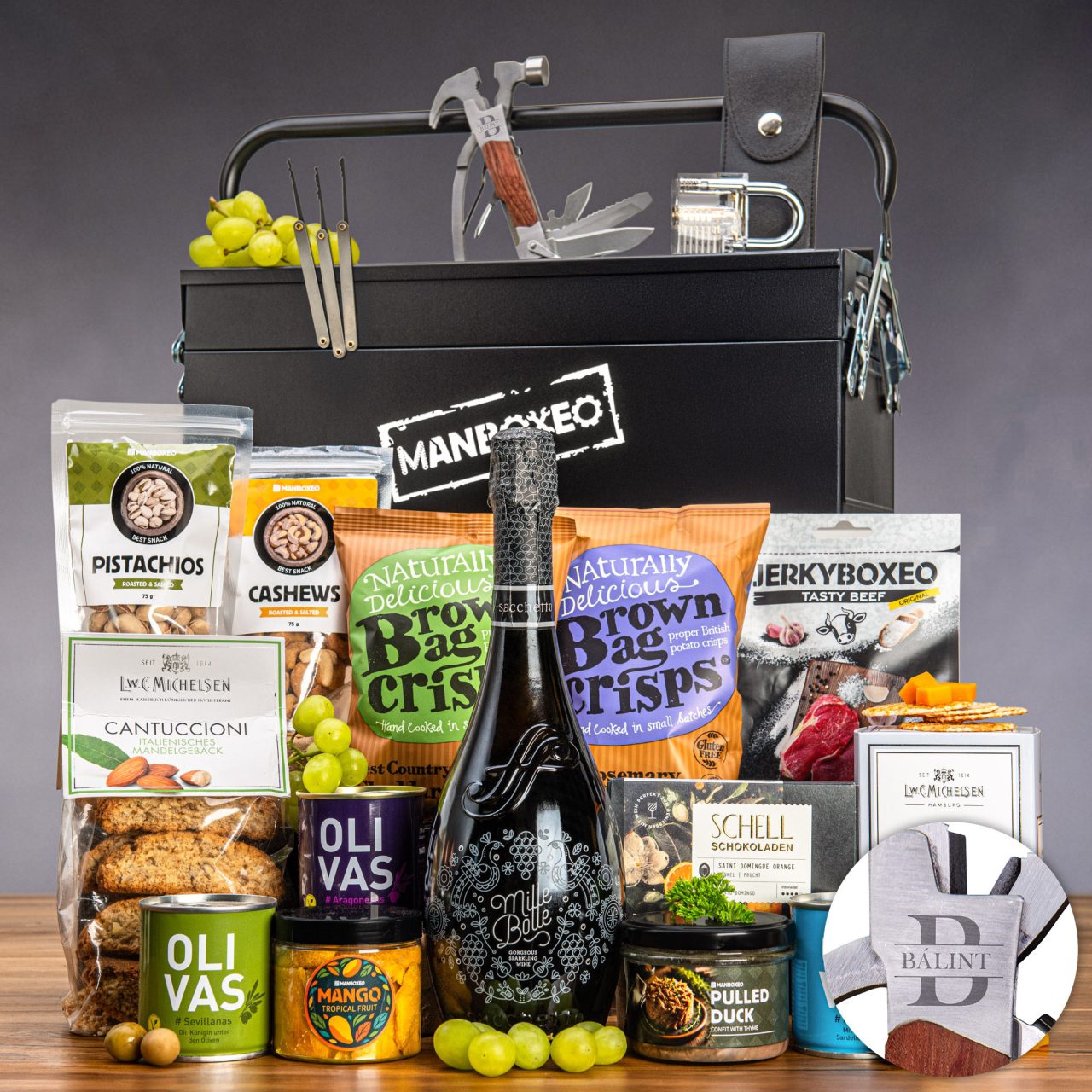Azt hitted, hogy ebben a fémdobozban csak szerszám lapul? Óriási tévedés, hölgyeim és uraim! Aki ezt a különlegességet kapja ajándékba, egy igazi gasztronómiai élményre számíthat. Egy palack minőségi proseccót válogatott finomságokkal párosítottunk, melyek tökéletesen kiegészítik az élvezetes italozást. Válogattunk húsos, sós és édes falatokat is – mindegyikük kóstolásért kiált. Ráadásként pedig meglepetésként egy multifunkciós szerszámot is mellékeltünk az ezermestereknek.