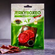 Jerkyboxeo TASTY BEEF LESS SALT 25 g – marha – Finoman sózott marhahús tökéletes ízharmóniával – kulináris élvezet minden falathoz.
