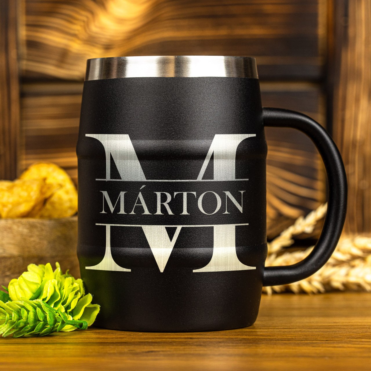 Fekete rozsdamentes acél söröskorsó gravírozással