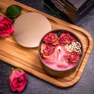 FÉM ILLATGYERTYA díszdobozban 200g – Rózsa – Ez az isteni rózsaillatú gyertya megtölti otthonod fénnyel és illattal, szárított virágokkal és kavicsokkal díszítve, amelyek égés közben csodásan csillognak.
