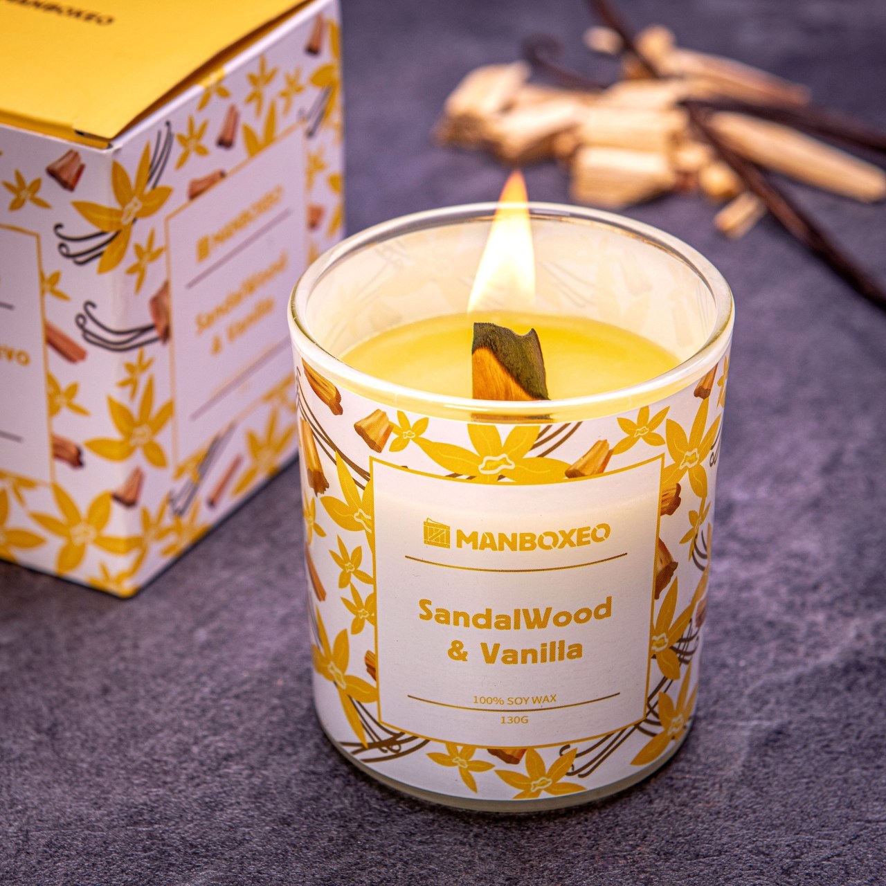 Luxus illatgyertya 130 g – Szantálfa & Vanília – Szeretitek a tűz ropogását, de nincs kandallótok? Ez a szójagyertya könnyedén pótolja. A fa kanóc égés közben megnyugtatóan ropog. A gyertya csodásan illatozik szantálfával és vaníliával. Nem vegyi cucc, csak a természet varázsa. Lepjétek meg vele szeretteiteket is!
