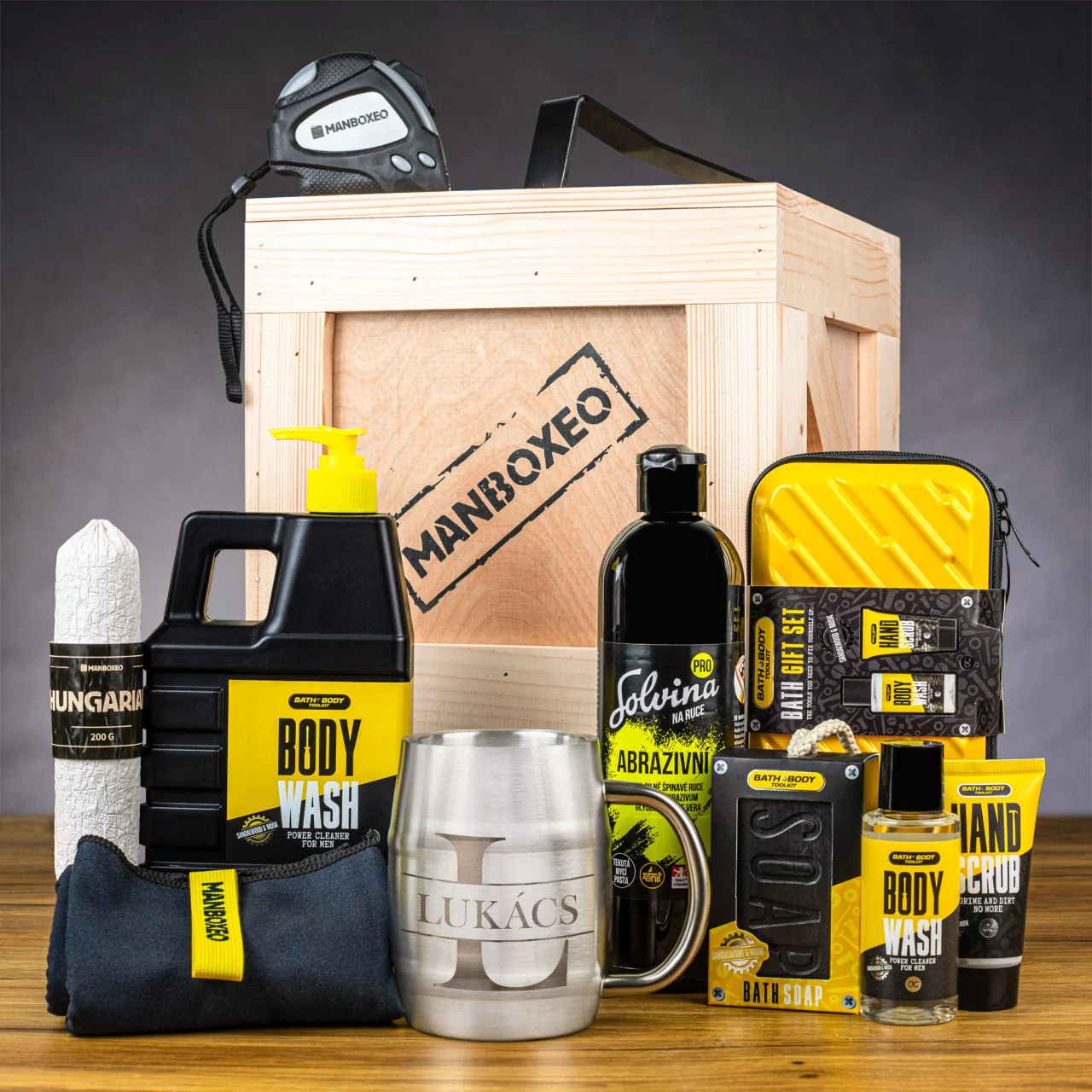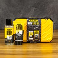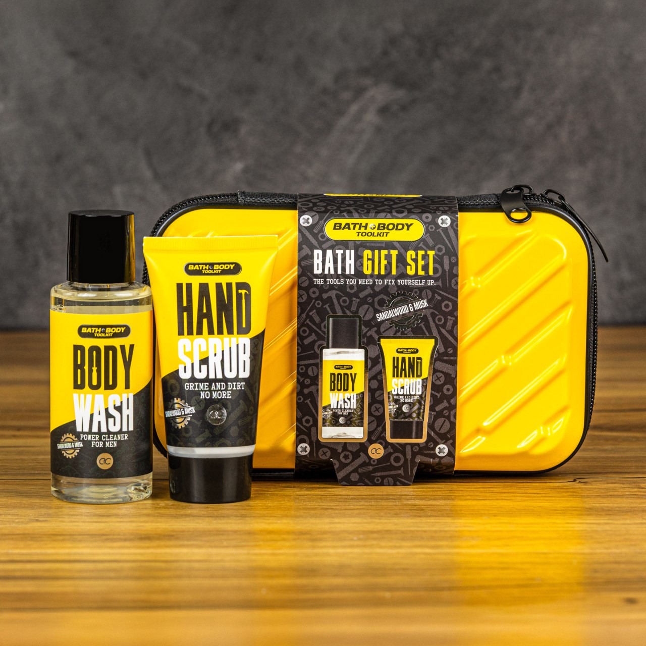Fürdőszett BATH and BODY TOOLKIT — Senki sem akarja az egész fürdőszobát cipelni a műhelybe vagy utazásra. Az utazószettünkkel könnyedén elboldogul. A készlet tartalmaz tusfürdőt és bőrradírt a különösen szennyezett kezekre.