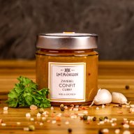 Kari hagyma konfitálva— Édes és egzotikus curry ízesített hagyma konfit, amely elbűvöli az érzékeidet. Tökéletes húsokhoz, raclette-hez, fondue-hoz és más finomságokhoz – igazi univerzális étel.