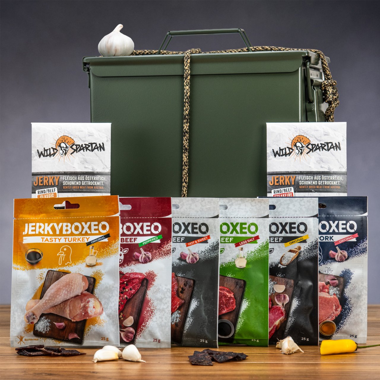Annak, aki szereti a minőségi szárított húst, ez a doboz maga az álom. Tele prémium jerky-vel különböző húsfajtákból és ellenállhatatlan ízekben, örömet szerez túrákon, edzéseken vagy egy esti film közben. Elég egy falat, és kezdődhet az ízforradalom.