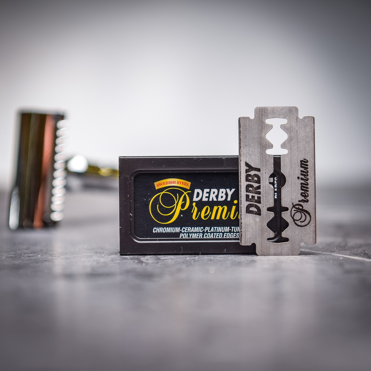 Extra éles Derby Premium Double Edge pengék – borotvapengék nélkül nem boldogul, ezért a dobozban 5 borotvapengét talál, külön viaszpapírba csomagolva. A borotvapengék a minőségi svéd polimer bevonatos, rozsdamentes acélból készülnek. Rugalmasak, vékonyak, simább a bőr borotválkozás után és hosszabb az élettartamuk. Törökországban gyártva.