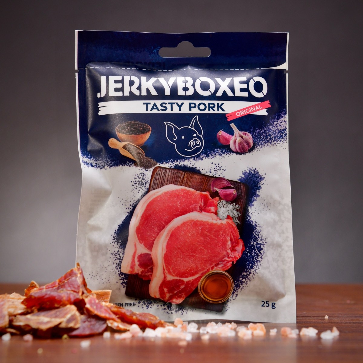 Jerkyboxeo szárított sertéshús - Original 25 g – a sertéshúsból és tengeri sóból készült eredeti specialitás még a legnagyobb ínyencek igényeit is kielégíti.
