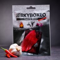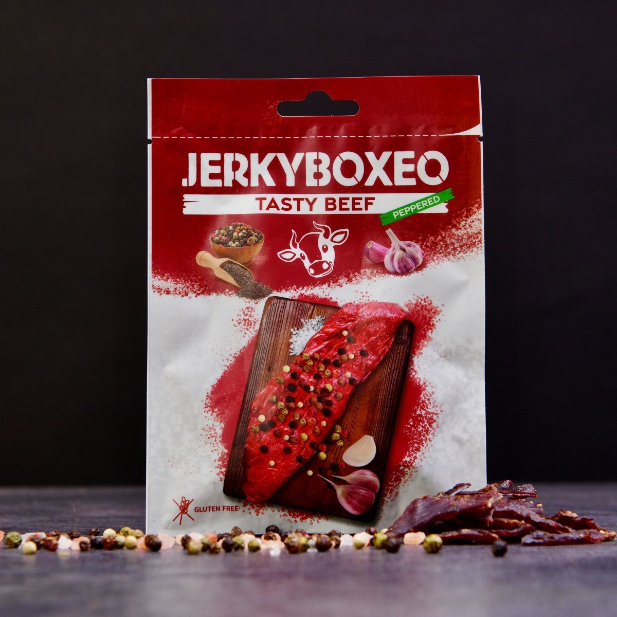 Fűszeres Jerkyboxeo szárított marhahús 25 g – a borssal arányos mértékben ízesített szárított marhahús valódi csemegének számít a szokatlanul fűszerezett ízvilágával.